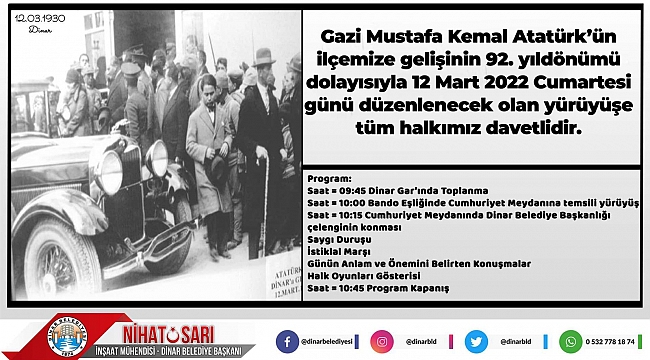 Ulu Önder Gazi Mustafa Kemal Atatürk’ün ilçemizi ziyaretlerinin Yıldönümü olan 12 Mart 2022 Cumartesi günü İlçemiz İstasyon Gar’ından Cumhuriyet Meydanına kadar temsili bir yürüyüş yapılacaktır.