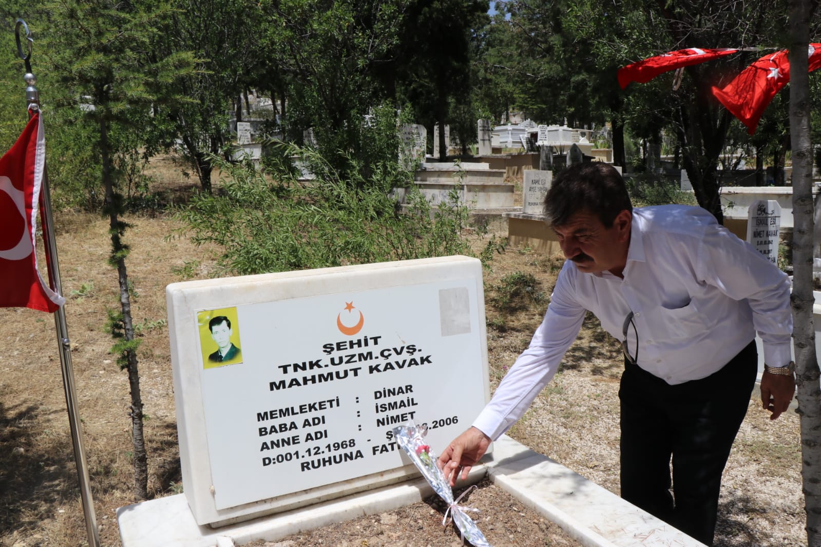Hatıra ormanı ziyaretinin ardından İlçemiz Asri Mezarlık’ta bulunan Şehitliği ve Bombacı Mehmet Çavuş’un kabrini ziyaret eden İlçe Kaymakamımız Kemal Duru, Dinar Belediye Başkanımız Nihat Sarı ve beraberindeki heyet şehitlerimizin kabri başına karanfil bırakarak dua ettiler.