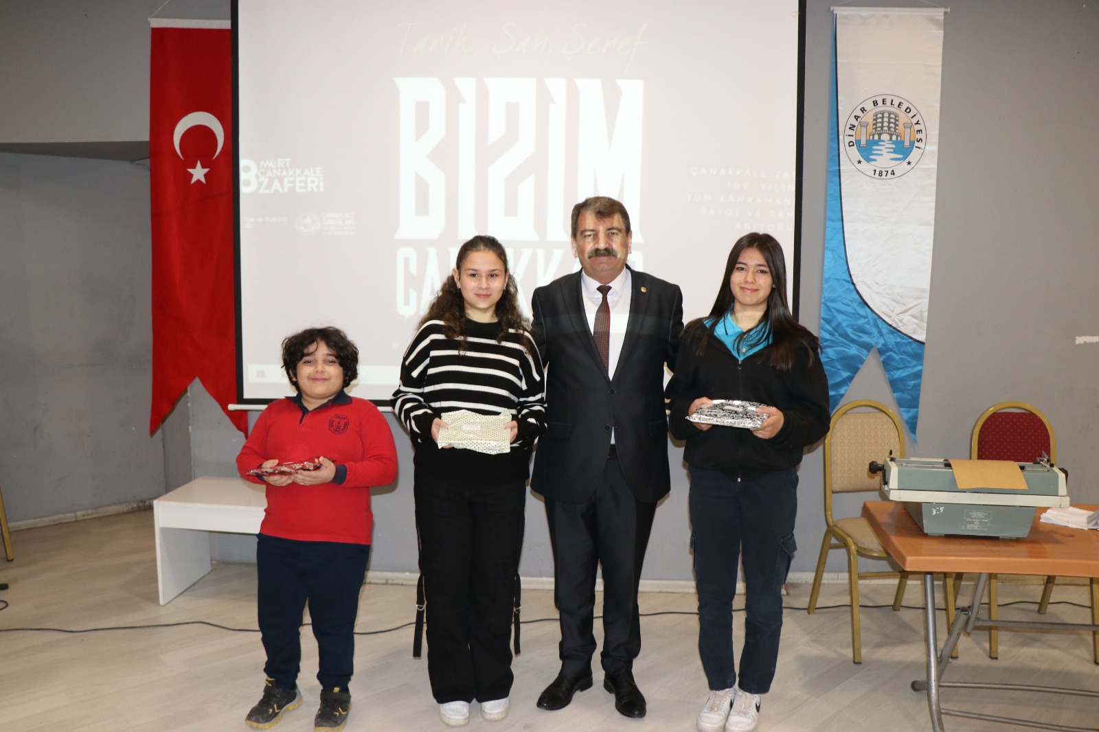 18 Mart Çanakkale Zaferi ve Şehitlerimizi Anma programı Dinar Belediye Başkanımız Nihat Sarı, İlçe Kaymakamımız Kemal Duru, Siyasi Parti İlçe Başkanları'nın katılımıyla Belediye Kültür Sarayı’nda çeşitli etkinliklerle gerçekleştirildi.Saygı duruşu ve İstiklal Marşımızın okunmasıyla başlayan program Kuran-ı Kerim tilaveti, günün anlam ve önemini belirten konuşmalar, şiirler, tiyatro gösterisi, Türkü dinletisi, Meçhul Askerler gösterisi gibi çeşitli etkinliklerle devam etti ve ödül törenine geçildi. Yarışmalarda derece yapan öğrencilere hediyelerini Belediye Başkanı Nihat Sarı, İlçe Kaymakamımız Kemal Duru ve Cumhuriyet Başsavcısı Emre Vurmaz’ın vermesiyle kutlama programı sona erdi.Dinar Gündem