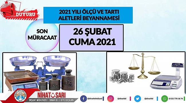İlçemiz sınırları içerisinde bulunan açık ve kapalı pazaryerinde kullanılan, masa terazileri, asma teraziler, tek kollu kantarlar, ibreli teraziler ve elektronik tartı aletlerinin periyodik muayene süresinin 2 yıl olduğu ve damga süresi dolmuş tartı aletlerinin periyodik muayeneleri için, vatandaşlarımızın muayene ve damga günü için Belediyemiz Ölçü ve Ayar Memurluğuna başvurmaları gerekmektedir. 26 Şubat 2021 Cuma günü mesai bitimine kadar müracaat etmeyenler hakkında 3516 sayılı ölçüler kanununun ilgili maddeleri uyarınca cezai işlem yapılacağından mükelleflerin herhangi bir sıkıntıya düşmemesi için gerekli beyanname başvuru işlemlerini takip etmeleri gerekmektedir.Dinar Gündem Gazetesi