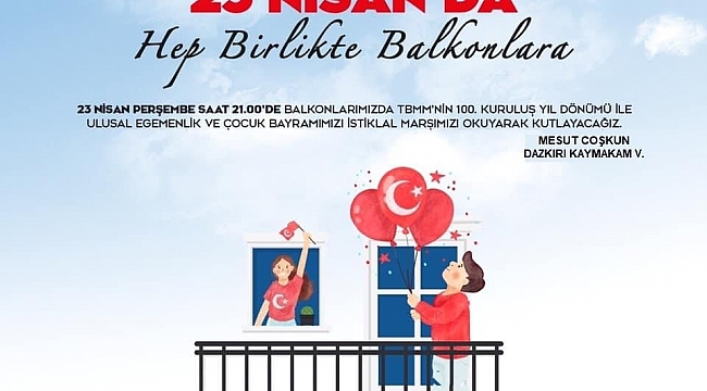 Dazkırı Kaymakamlığı; Bağımsızlığımızı ve vatanımızın bölünmez bütünlüğünü ifade eden, Türk Milletinin iradesini temsil eden, Milleti’nin kendi geleceğini belirlediği Türkiye Büyük Millet Meclisinin 100. Kuruluş Yıl Dönümü ve Gazi Mustafa Kemal Atatürk’ün tüm dünya çocuklarına armağan ettiği 23 Nisan Ulusal Egemenlik ve Çocuk Bayramı’nı milletçe birlik ve beraberlik içerinde kutlamanın gurur ve mutluluğunu yaşayacağımız 23 Nisan 2020 Perşembe günü saat 21:00'de merkezi sis sistemlerinden İstiklal Marşımızı yayınlayacağız.