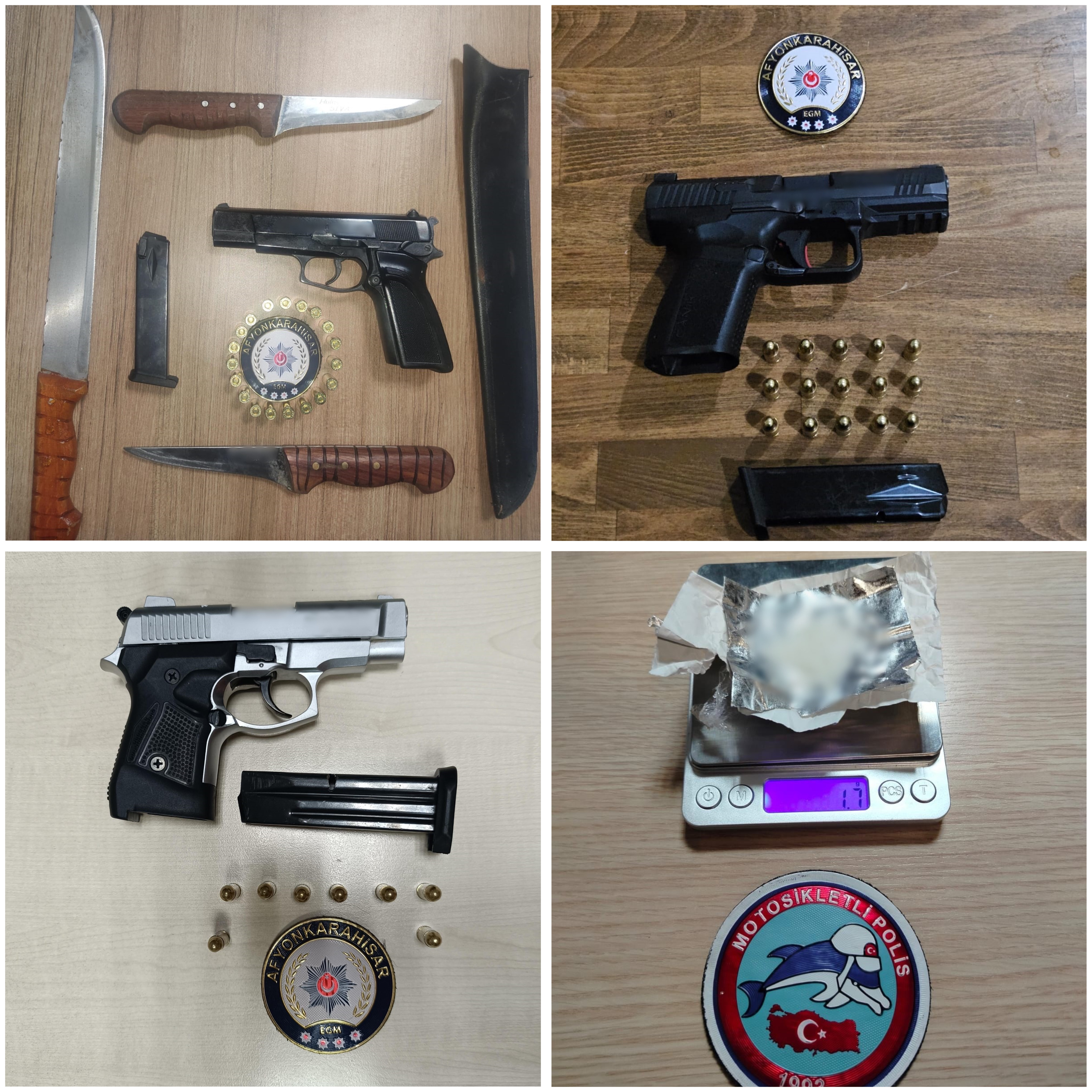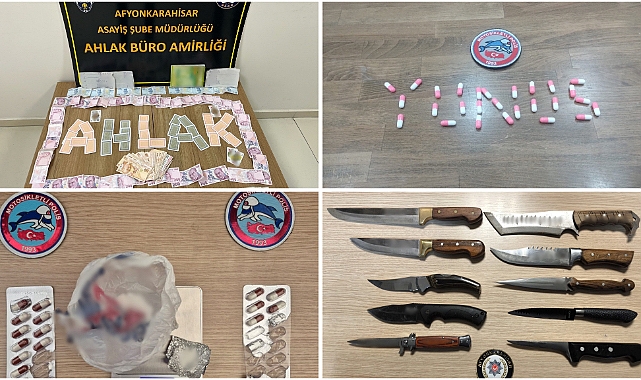 Afyonkarahisar İl Emniyet Müdürlüğü görevlilerimizce 03 – 09 Mart 2025 tarihleri arasında; · Aranması olan şahıslara yönelik yapılan çalışmalar,· Şok uygulamalar,· İlimizde bulunan Kız Öğrenci Yurtları çevresi,· İl genelinde yapılan tüm uygulama ve kontrollerde; - 9.806 şahıs sorgusu, 2.566 araç sorgusu yapılmış, aranması olan şahıslara yönelik olarak yapılan yakalama çalışmaları neticesinde hapis cezası bulunan 9 şahıs ve ifadesinin alınmasına yönelik 11 şahıs olmak üzere toplam 20 şahıs yakalanmış, - Yapılan uygulama ve kontrollerde 6 adet tabanca, 4 adet tüfek, 2 adet kurusıkı tabanca, 54 adet bıçak ve 25 adet fişek, 2,3 gr uyuşturucu madde, 2,3 gr uyuşturucu madde, 4 adet uyuşturucu madde, 67 adet uyuşturucu madde ele geçirilmiştir. - Toplamda 84 şahsa ve 38 araca idari para cezası uygulanmıştır. - “Kumar Oynanması İçin Yer ve İmkan Sağlama” suçundan yürütülen 1 tahkikatta 1 şüpheli yakalanarak adli işlem uygulanmış, 5 şahsa idari para cezası uygulanmıştır. -Ele geçen 54 adet kesici ve delici alet (bıçak) ile ilgili olarak 54 şahsa idari para cezası uygulanmıştır.