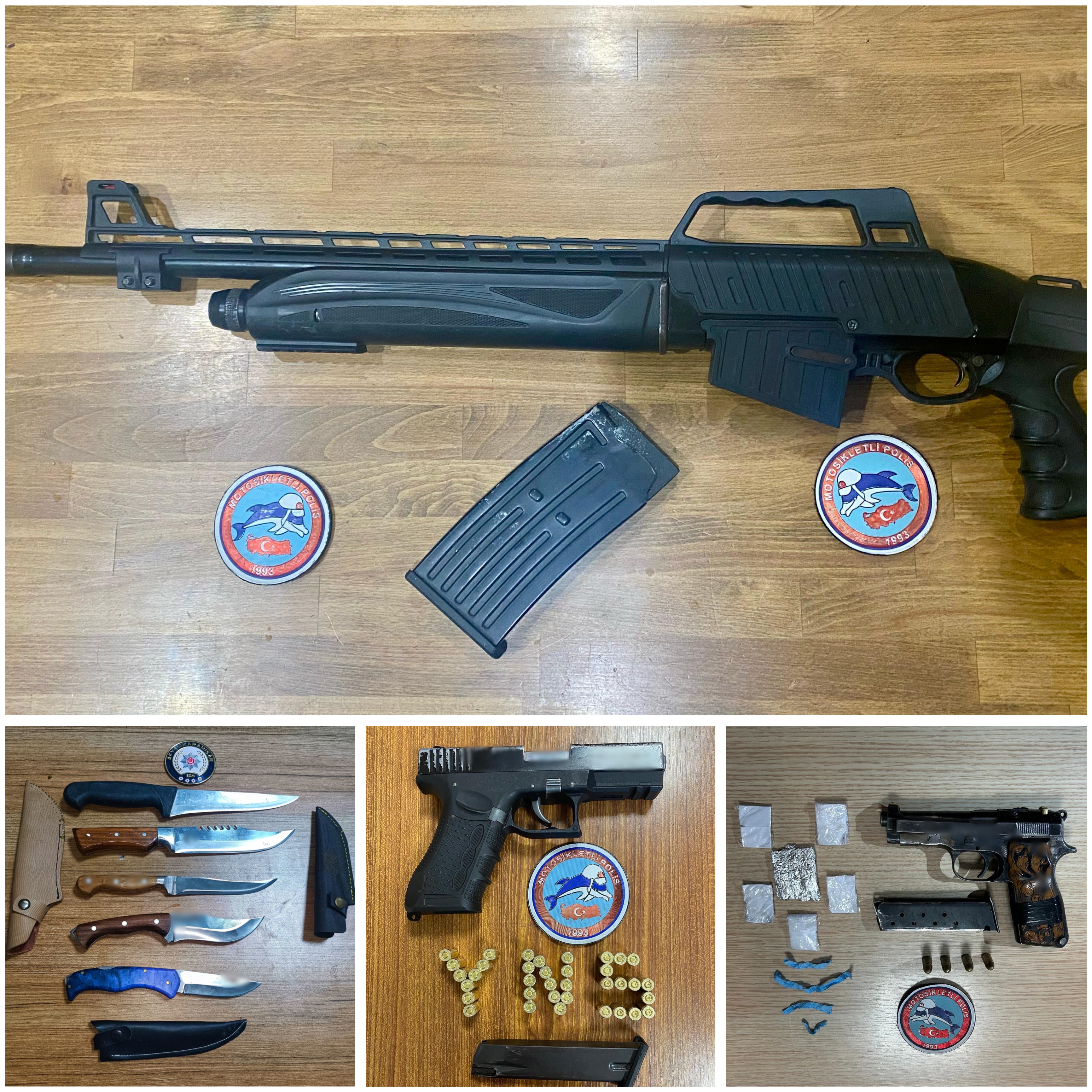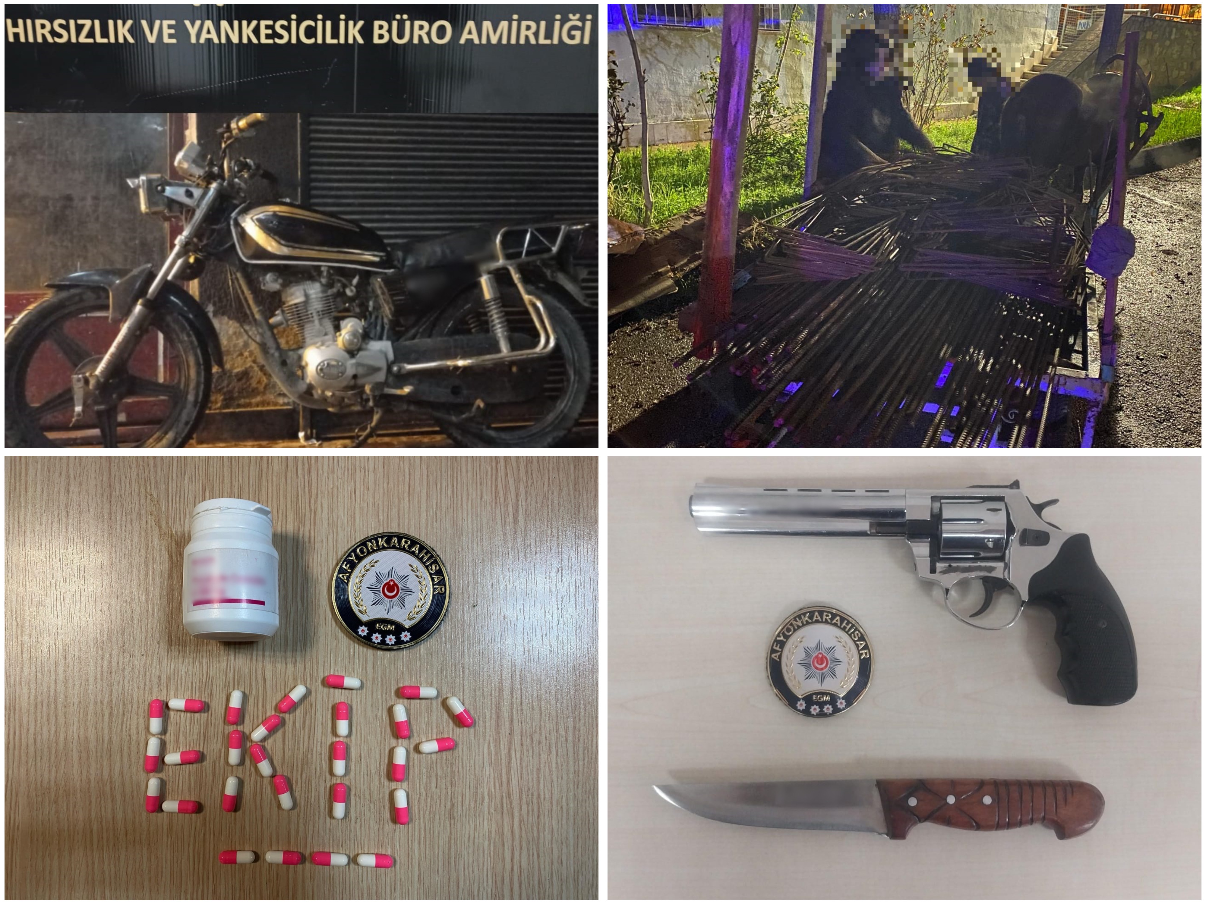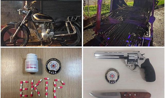 Afyonkarahisar İl Emniyet Müdürlüğü görevlilerimizce 24 Mart- 6 Nisan 2025 tarihleri arasında; · Aranması olan şahıslara yönelik yapılan çalışmalar,· Şok uygulamalar,· İlimizde bulunan Kız Öğrenci Yurtları çevresi,· İl genelinde yapılan tüm uygulama ve kontrollerde; - 14.901 şahıs sorgusu, 4.894 araç sorgusu yapılmış, aranması olan şahıslara yönelik olarak yapılan yakalama çalışmaları neticesinde hapis cezası bulunan 15 şahıs ve ifadesinin alınmasına yönelik 16 şahıs olmak üzere toplam 31 şahıs yakalanmış, - Yapılan uygulama ve kontrollerde 7 adet tabanca, 4 adat kurusıkı tabanca, 6 adet tüfek, 102 adet bıçak ve 139 adet fişek, 3,7 gr uyuşturucu madde, 9,4 gr uyuşturucu madde, 18 adet uyuşturucu madde, 91 adet uyuşturucu madde ele geçirilmiştir. - İl merkezinde meydana gelen Fuhşa Teşvik Aracılık veya Zorlama olayı ile ilgili olarak yapılan çalışmalar neticesinde 2 şüpheli yakalanarak idari işlem yapılmıştır. - İl merkezinde meydana gelen Açıktan Hırsızlık olayı ile ilgili olarak 1 şüpheli ve 1 SSÇ suçüstü yakalanmış, adli işlemler neticesinde 1 şüpheli tutuklanmış, 1 SSÇ ailesine teslim edilmiş, olayda suça onu 1 ton inşaat demiri ele geçirilmiştir. - İl merkezinde meydana gelen Motosiklet Hırsızlığı olayı ile ilgili olarak 1 şüpheli yakalanmış, olayda suça konu 1 motosiklet sahibine teslim edilmiştir. - Toplamda 110 şahsa ve 66 araca idari para cezası uygulanmıştır. - Ele geçen 102 adet kesici ve delici alet (bıçak) ile ilgili olarak 102 şahsa idari para cezası uygulanmıştır.