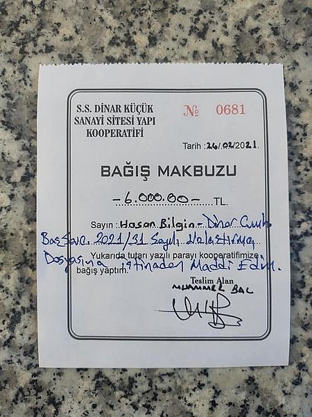 Dinar Sanayi Kooperatifi Başkanı Ali Akpınar sosyal medya hesabından yaptığı açıklaması şu şekilde. :DİNAR KAMUOYUNADostlar Adalet Yerini Buldu Sanayi Sitesinde Başkan Seçildikten Sonra Çevre Düzenlemesi Yaparken Sorunlu Kiracı Esnafımız Hurdacı Hasan İsimli Şahıs ‘Konteyneri Kaldır’ DediğimZaman Yavan Hırsızın Ev Sahibini Bastırır Gibi Sorun Çıkararak Kaldırmam Diyerek.Polis Çağırmış Şahsım ve Oğlum Adına Ruhsatsız Silah Taşıyorlar Diye Şikayette Bulunmuştur.Fakat Gelen Memur Arkadaşlara Taşıma Ruhsatlarımızı Gösterince Bu Sefer de Hakaret Ettiğimiz Yalanını Söyleyerek Şikayette Bulunmuştur.Ancak Adli Mercilerin Araştırması Sonucu Takipsizlik Kararı Alınmıştır. Bu Kapsamda Bize Atılan Gerçek Olmayan İftiradan Beraat Ettik.Ancak Şimdi Bizler İftiraya Uğradığımız için Bize Dava Açma Yolu Göründü Bu Durumda Devletimiz Ara Bulucu Bir Arkadaşımızı Görevlendirdi Karşılıklı Görüşmemiz Sonucu Hurdacı Hasan’dan Yalnız Bir Şekilde Davacı Olmayacağımızı Bunun da Hurdacı Hasan’ın SS. Dinar Küçük San. Sit. Yapı Kooperatifine 6000TL Bağış Yapması Gerektiğini Söyledik ve İsteğimiz Kabul Oldu.Bundan da Anlaşılıyor ki Adalet Yerini Buldu. Sanayimizde Kimse Kimseden Üstün Değildir.Herkes Kurala Uyacak Diye Başkan Adayı Olduğum Zaman Bunları Söylediğimde Bazı Arkadaşlar Hurdacı Hasan Kanunları İyi Biliyor Onunla Ters Düşme DiyorlardıAncak Yanıldıkları Bir Şey Vardı.Eskilerin Tabiriyle Ali AKPINAR Hayatın Her Türlü Zorluklarından Geçmiş Yani Mektebi Hayriye’yi Birincilikle Bitirmişti. Onun İçin Herkes Sanayide Bir Biriyle Saygılı Olarak Yaşamaya Alışacak.NE MUTLU DİNARLIYIM DİYENENE MUTLU TÜRKÜM DİYENE