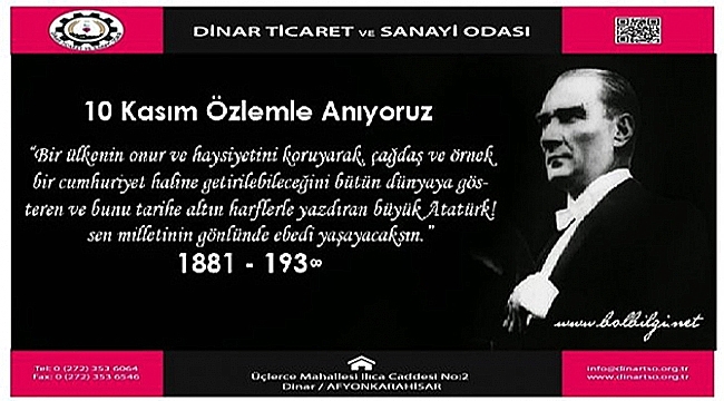 Dinar Ticaret ve Sanayi Odası Yönetim Kurulu Başkanı Abdullah Bağırkan Gazi Mustafa Kemal Atatürk'ün vefatının 82. yıl dönümünde bir anma mesajı yayınladı.