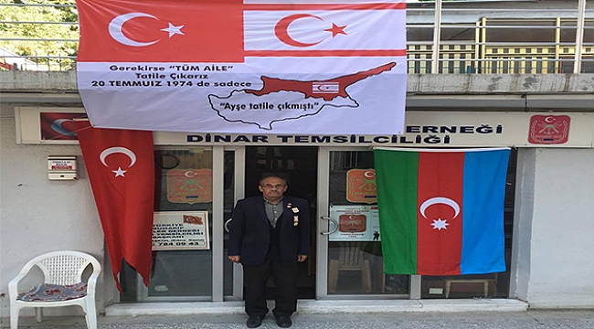Türkiye Muharip Gaziler Afyonkarahisar Dinar Şube Temsilcisi Cengiz Kartal, Ermenistan’ın saldırısına uğrayan Azerbaycan’a manevi destek verdi. Avrupa Birliğini protesto etmek için şube binasının ününe Türk Bayrağı ve Azerbaycan Bayrağını takarak destek verdi.İki Kardeş ülkenin bayraklarını taktığını aktaran Türkiye Muharip Gaziler Dinar Şube Başkanı Cengiz Kartal, ‘Ermenistan’ın Azerbaycan’a yönelik sivil yerleşim yerlerine hedef alan saldırısını şiddetle kınıyoruz."Ayşe Tatile Çıksın" Parolasını ben size kısaca şöyle anlatayım. Dönemin başbakanı Bülent Ecevit, dönemin Dışişleri Bakanı Turan Güneş'e ''Ayşe Tatile Çıksın'' parolasını iletti ve 14 Ağustos 1974 günü saat sabah 04:30'da Kıbrıs'taki Türk birlikleri harekete geçildi.