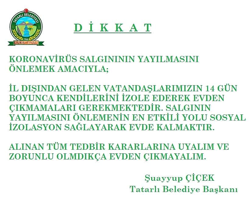Başkan Çiçek, 14 Gün Evde Kal Uyarısı YaptıTatarlı Belediye Başkanı Şuayyup Çiçek il dışından gelen vatandaşlara yönelik 14 gün izolasyon tedbirleri kapsamında duyuru yaptı.