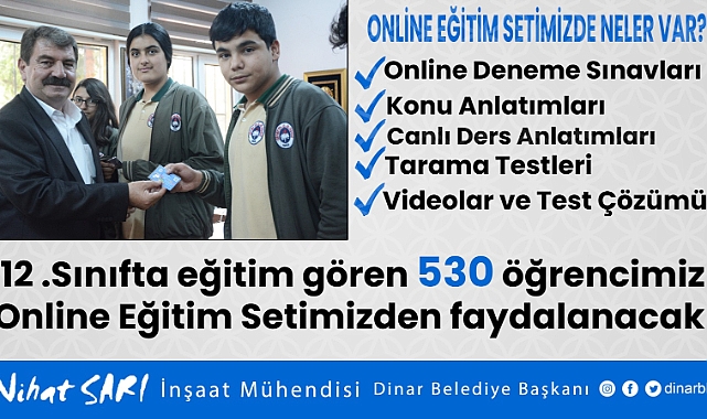 Dinar Belediye Başkanımız Nihat Sarı, “Eğitim Desteği Hizmetleri” kapsamında ilçemizde bir ilke imza atarak ilçemiz merkezinde Lise düzeyinde eğitim gören 12. Sınıf öğrencilerimizin online deneme sınavı, konu anlatımı, test çözümü, canlı dersler vb. hizmetlerden ücretsiz olarak faydalanması için Online Eğitim Destek Seti’nin dağıtımını gerçekleştirdi.