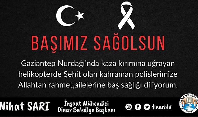 Gaziantep Nurdağı’nda kaza kırımına uğrayan helikopterde Şehit olan kahraman polislerimize allahtan rahmet, ailelerine baş sağlığı diliyorum.Nihat Sarı Dinar Belediye Başkanı