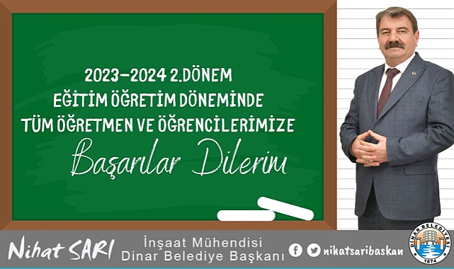 Dinar Belediye Başkanımız Nihat Sarı, 5 Şubat’ta başlayan 2023-2024 2.dönem eğitim-öğretim yılı dolayısıyla bir mesaj yayımladı.Öncelikle 2. dönem eğitim – öğretim yılının, başta geleceğin teminatı öğrenciler olmak üzere tüm eğitim camiasına hayırlı olmasını dileyen Başkanımız Nihat Sarı, şunları kaydetti: “Bugüne kadar eğitim için hiçbir fedakârlıktan kaçınmadan tüm imkânlarını seferber eden Dinar Belediyesi aynı düstur ile çalışmalarına bundan sonra da devam edecektir.