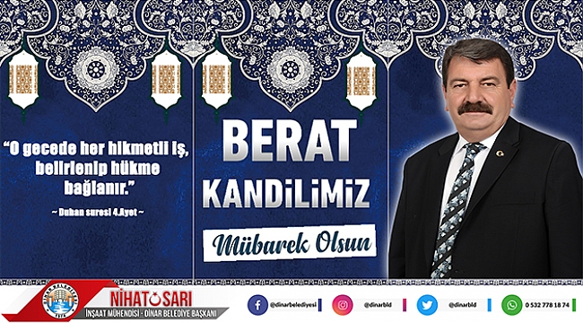 Dinar Belediye Başkanımız Nihat Sarı, Berat Kandili dolayısıyla bir mesaj yayımladı.Belediye Başkanımız Nihat Sarı mesajında; “Tefekkür ve şükür vesilesi olan Mübarek Berat Kandili, merhametin, iyiliğin, umut ve huzurun gecesi, On Bir Ayın Sultanı Ramazan-ı Şerif´in müjdecisidir. Ramazan-ı Şerif´i müjdeleyen bu anlamlı gece, birliğimizi, beraberliğimizi ve gönül bağlarımızı güçlendirmeye vesile oluyor.Bu vesileyle Tüm İslam aleminin ve hemşerilerimin On Bir Ayın Sultanı Ramazan-ı Şerif´in müjdecisi olan Berat Kandili’ni kutluyor, birlik, beraberlik, barış ve huzur dolu bir Ramazan ayına sizlerle birlikte ulaşmayı temenni ediyorum. ‘’ İfadelerini kullandı.Dinar Gündem Gazetesi