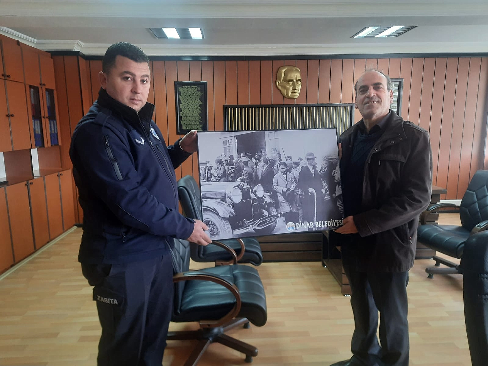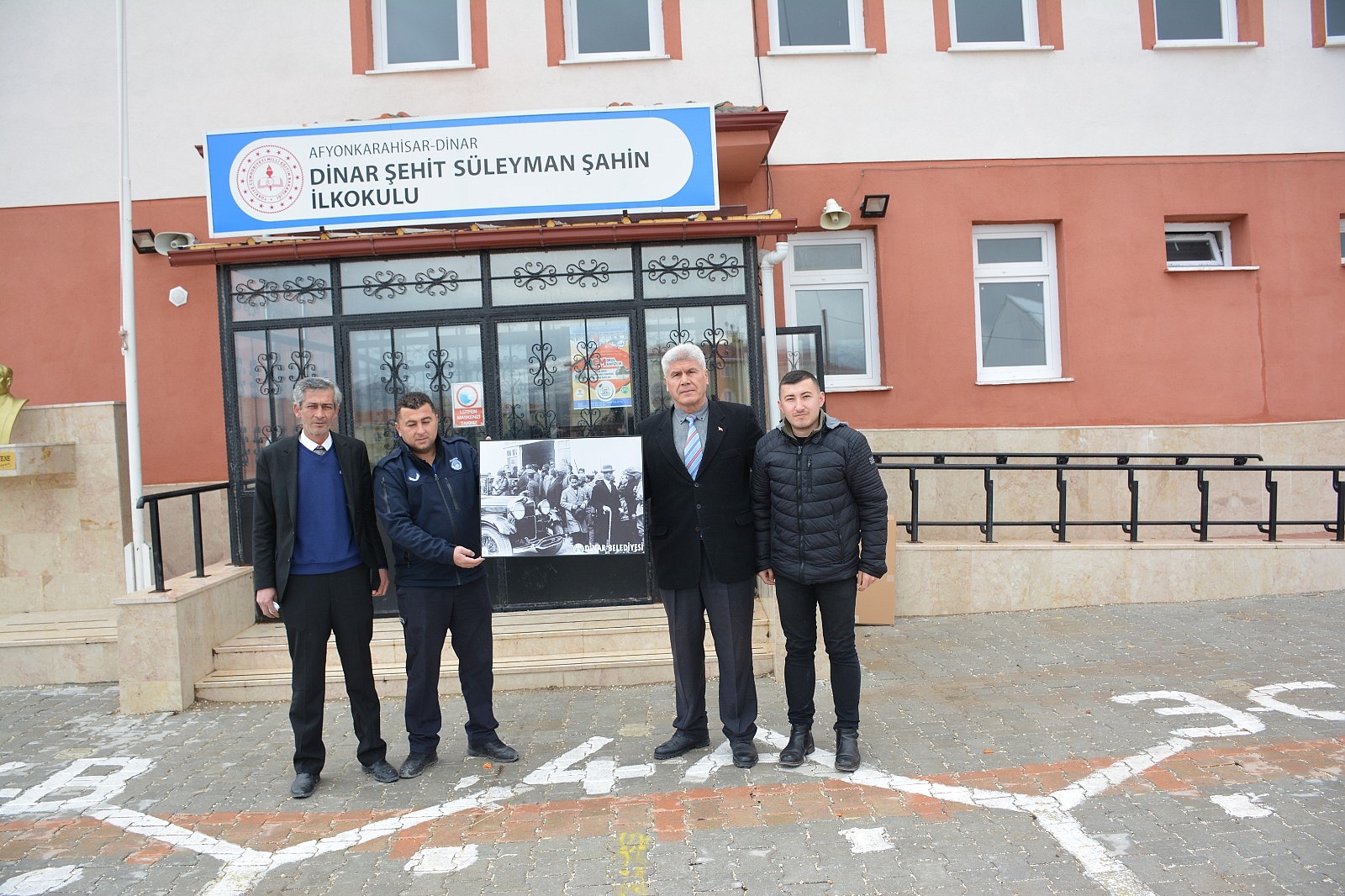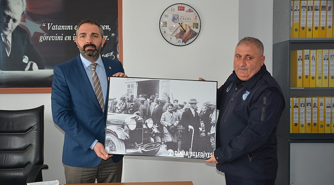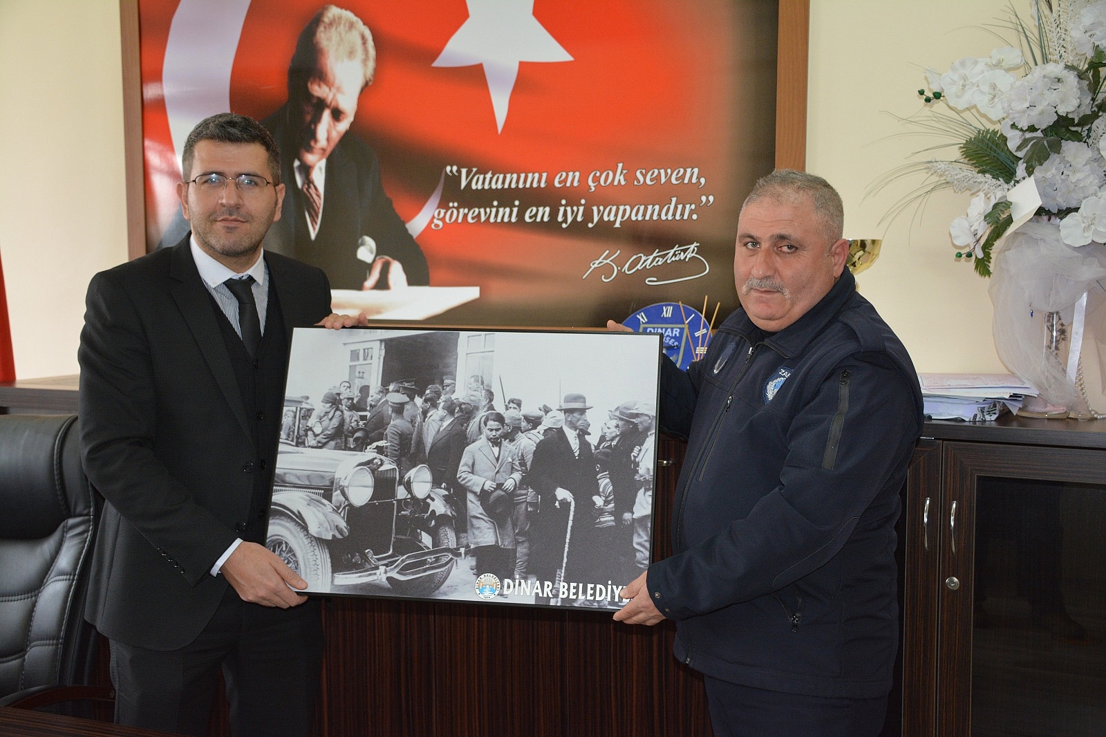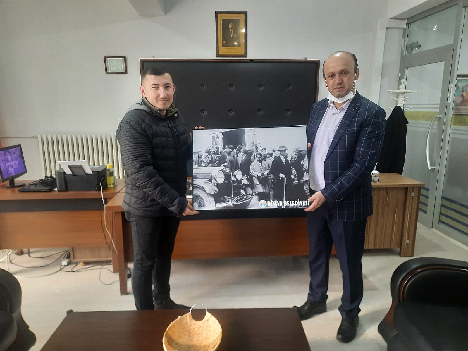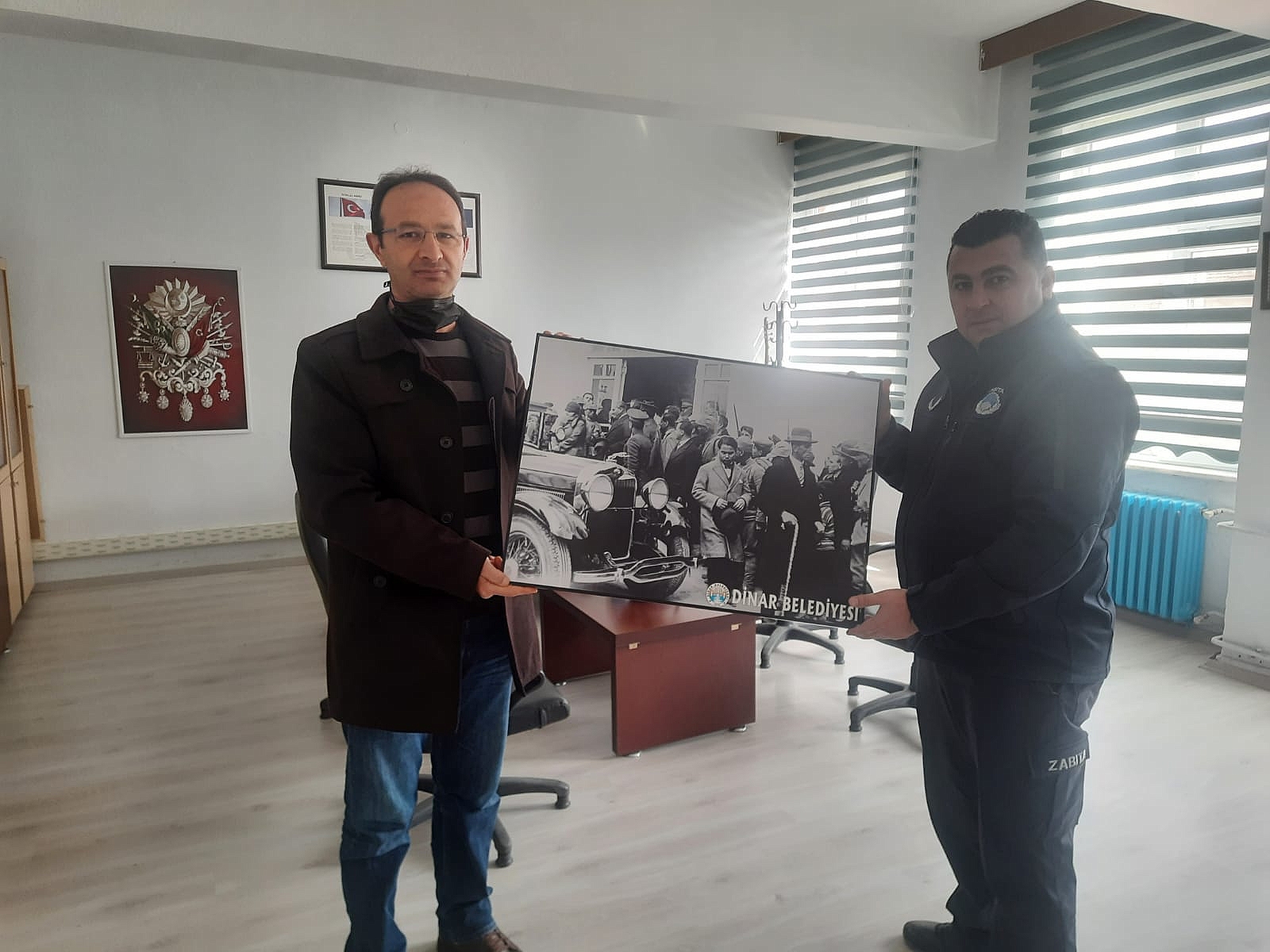 Dinar İlçe Kaymakamı Selami Kapankaya’ya, Dinar İlçe Milli Eğitim Müdürü Ufuk Taşbaş’a ve Atatürkçü Düşünce Derneği Şube Başkanı Kenan Özdemir’e Atatürk’ün Dinar’a gelişinin görselinin yer aldığı tabloyu hediye eden Belediye Başkanımız Nihat Sarı, 12 Mart Atatürk’ün Dinar’a gelişinin yıldönümü olması dolayısıyla belediye olarak anlamlı bir çalışmaya imza attıklarını ifade ederek, “Ülkemizin kurucusu Gazi Mustafa Kemal Atatürk’ü ve tüm silah arkadaşlarını bir kez daha sevgi, saygı ve minnetle anıyorum.” Dedi.
