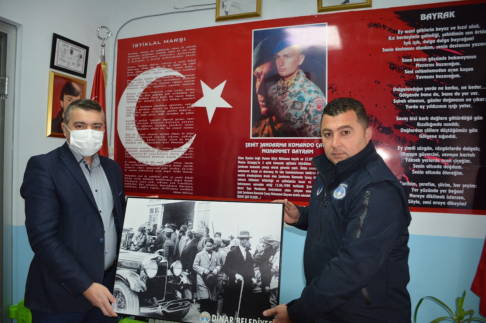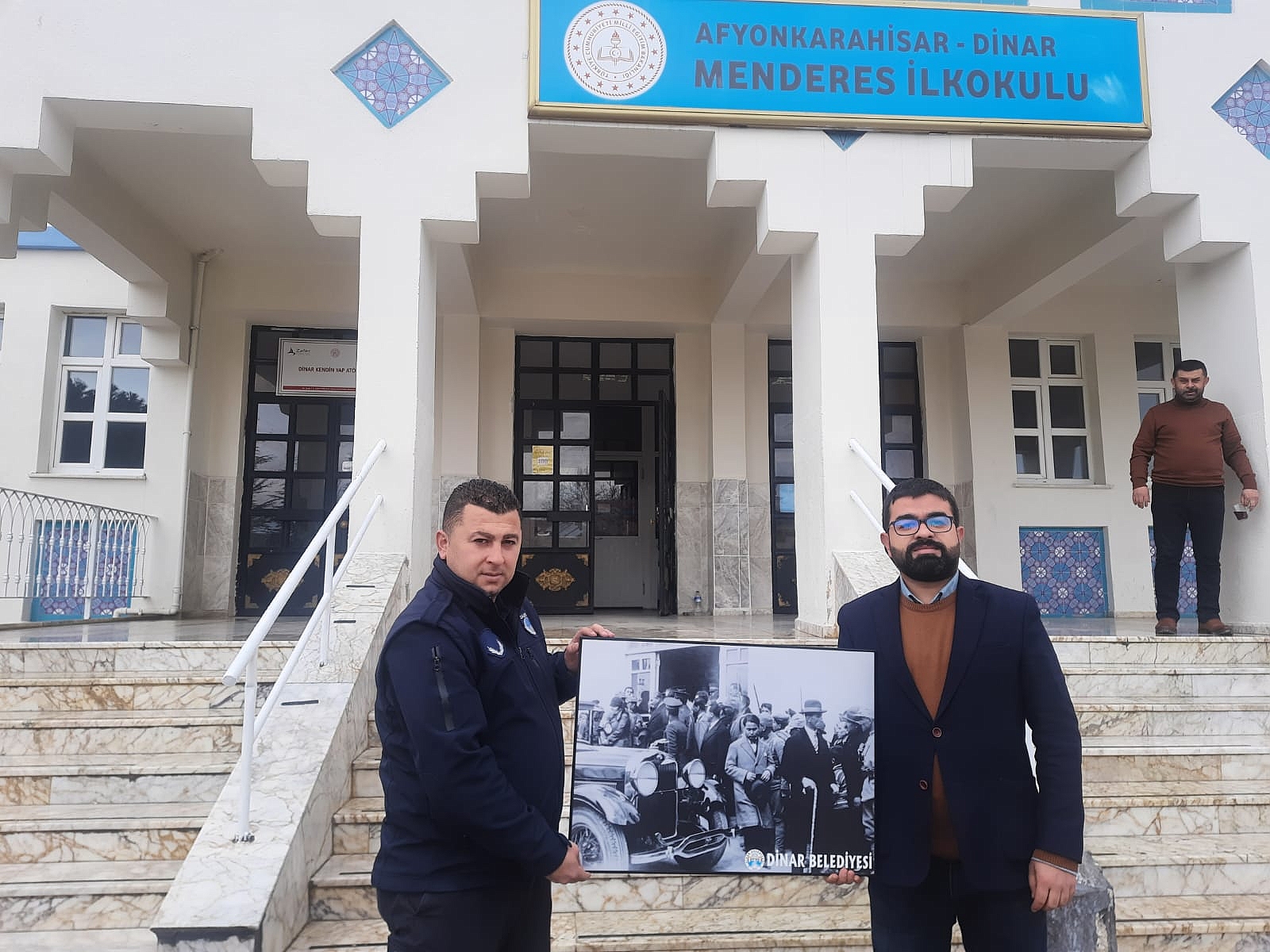 Dinar Belediye Başkanımız Nihat Sarı’nın talimatlarıyla Belediyemiz Kültür Hizmetleri kapsamında; 12 Mart Atatürk’ün Dinar’a gelişinin 101.yıldönümü olması dolayısıyla ilçemiz merkezinde bulunan tüm okullara belediyemiz zabıta ekipleri tarafından Atatürk’ün Dinar’a gelişinin görselinin yer aldığı tablo hediye edildi.
