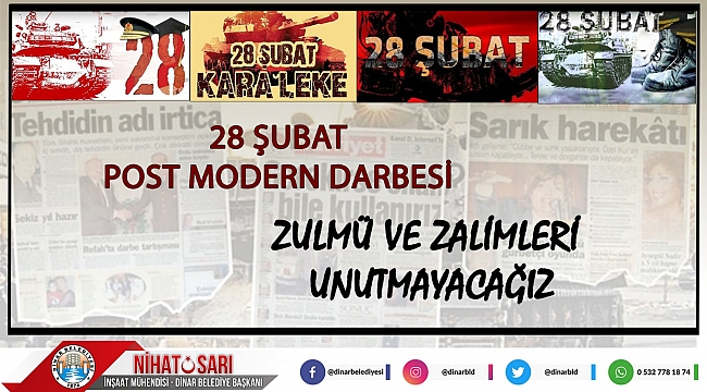 Dinar Belediye Başkanımız Nihat Sarı post-modern darbe olarak nitelenen 28 Şubat'ın 24. yılı dolayısıyla mesaj yayımladı.
