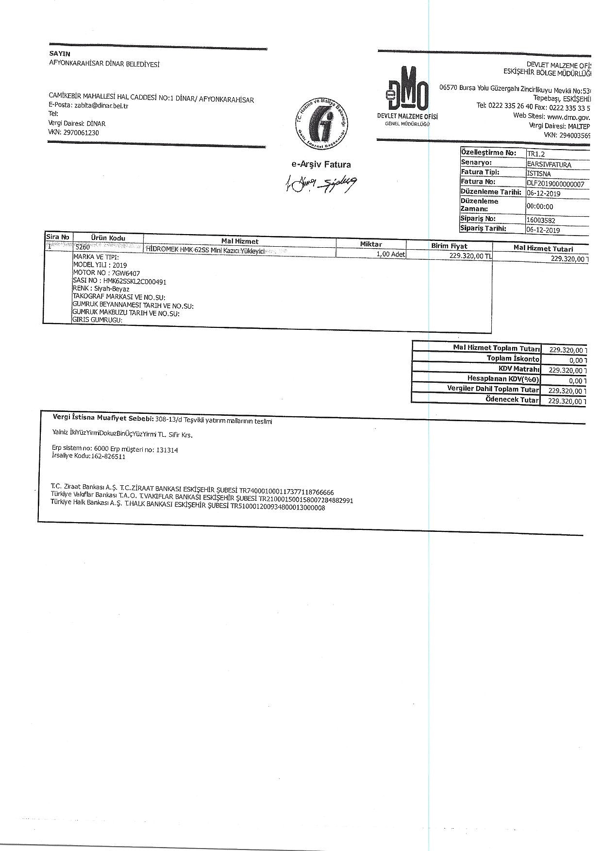 Başkan Sarı dan açıklamaDinar Belediye Başkanımız Nihat Sarı Belediyemize satın alınan araçlarla ilgili bir açıklama yaptı. Başkan Sarı alınan araçlar ile ilgili yaptığı açıklamada; “Dinar Belediyesi olarak belediyemiz araç filosuna geldiğimiz günden itibaren toplam 5 adet araç kazandırdık. Bu araçların 4 tanesi Devlet Malzeme Ofisinden alınmış olup bu araçlar 1 adet Erkunt marka traktör, 2 adet Hidromek kazıcı yükleyici ve 1 adet Ford transit marka kamyonettir. 1 adet ise Mastaş marka kazıcı yükleyici Çevre ve Şehircilik Bakanlığından hibe olarak alınmıştır Devlet Malzeme Ofisinden 1 adet Mini Süpürge aracı da satın alınmış olup belediyemize Şubat Ayı içerisinde teslimatı yapılacaktır. . Alınan araçların faturaları da haberin alt kısmında yer almaktadır. İnşallah araç filomuzu daha da artıracak ve vatandaşlarımıza daha hızlı hizmet sunacağız.” dedi.