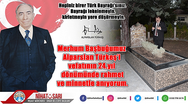 Dinar Belediye Başkanımız Nihat Sarı, yakın tarihin bir dönemine damgasını vuran Başbuğ Alparslan Türkeş’in aramızdan ayrılışının 24. yıl dönümü nedeniyle bir mesaj yayımladı.Belediye Başkanımız Nihat Sarı mesajında, “Merhum Liderimiz Başbuğ Alparslan Türkeş, seksen yıllık ömrü boyunca hayatını ülkesine, milletinin bekasına ve devamlılığına adayan örnek bir dava adamıdır. Çizdiği yolda kararlı, istikrarlı ve doğru inançlı bir politika sergileyen liderimiz Alparslan Türkeş’in vefatıyla ülkemiz çok şey kaybetmiştir. Yıllar önce ortaya koyduğu ilkeleri ile günümüzde de ona ne kadar ihtiyaç duyulduğunun bir göstergesidir. Mücadelelerle geçen seksen yıllık ömründe “önce ülkem ve milletim” diyerek, Türk milletinin yücelmesi konusunda önemli çalışmalar yapmıştır. Türk milliyetçiliği davası, rahmetli Başbuğumuzun önderliğinde büyük bir fedakârlıkla yükselmiş ve bugünlere gelmiştir. Ülküsü ve fikirleri bizlere her zaman ışık olmuştur. Hayatı boyunca, Türkiye üzerine oynanan çirkin oyunları hep fark etmiş ve bu oyunlara karşı çıkmıştır. Verdiği demokrasi mücadelesi her geçen gün daha iyi anlaşılan ve gönlümüzdeki yeri hiç değişmeyecek olan Merhum Başbuğumuz Alparslan Türkeş’i aramızdan ayrılışının 24. ölüm yıl dönümünde saygı, sevgi ve rahmetle yâd ediyorum” dedi.Dinar Gündem Gazetesi