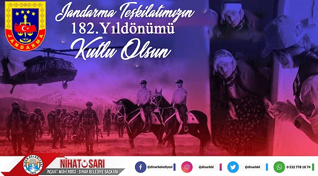 Dinar Belediye Başkanımız Nihat Sarı, mesajında; " Aziz Türk milletimizin sonsuz güvenine mazhar olmayı başaran Türkiye Cumhuriyeti Jandarma Teşkilatı, kurulduğu günden bu yana yaşamımızın her anında ve ülkemizin her noktasında gece gündüz demeden halkımızın hizmetinde olmuş, bundan sonra da olmaya devam edecektir. Halkımızın huzur ve güvenliğinin sağlanması için çalışan, suç ve suçlularla mücadelede dünyaya örnek olan Jandarma teşkilatımız, görevini fedakârca yerine getirmesiyle halkımızın güvenlik güçlerimize olan güvenini artırmaktadır. Bu duygu ve düşüncelerle Jandarma Teşkilatımızın 182'inci kuruluş yıldönümünü tebrik ediyor; bu kutsal üniformaya emeği geçen bütün geçmiş büyüklerimizi, şehitlerimizi, gazilerimizi rahmet ve şükranla anıyorum" dedi.Dinar Gündem Gazetesi