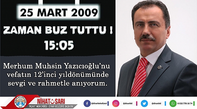 Başkan Sarı’dan Merhum Muhsin Yazıcıoğlu’nu Anma MesajıDinar Belediye Başkanımız Nihat Sarı, yaşadığı elim bir helikopter kazası sonucu hayatını kaybeden Muhsin Yazıcıoğlu'nun ölüm yıldönümü nedeniyle bir anma mesajı yayımladı.