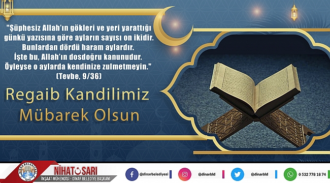 Dinar Belediye Başkanımız Nihat Sarı, Regaib Kandili dolayısıyla bir kutlama mesajı yayınladı. Belediye Başkanımız Nihat Sarı mesajında; " Üç ayların da başlan