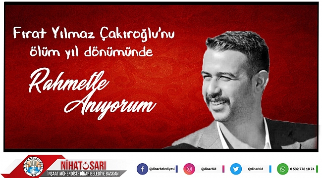 Başkan Sarı’dan Şehit Fırat Yılmaz Çakıroğlu’nu Anma mesajıDinar Belediye Başkanımız Nihat Sarı, 20 Şubat 2015 yılında Ege Üniversitesi’nde meydana gelen olaylarda Ülkü Ocakları Ege Üniversitesi Teşkilat Başkanı Fırat Yılmaz Çakıroğlu’nun hayatını kaybetmesinin 6.yıl dönümünde bir mesaj yayımladı.Dinar Belediye Başkanımız Nihat Sarı mesajında:”6 yıl önce İzmir’de alçak terör örgütü pkk yandaşları tarafından öldürülen Fırat Yılmaz Çakıroğlu’nu şehadetinin yıl dönümünde rahmetle anıyorum. Alçak terör örgütünün bizden kopardığı yiğit gençlerimizi unutmadık, unutmayacağız. Rabbim mekanını cennet eylesin.” İfadelerini kullandı.Dinar Gündem Gazetesi