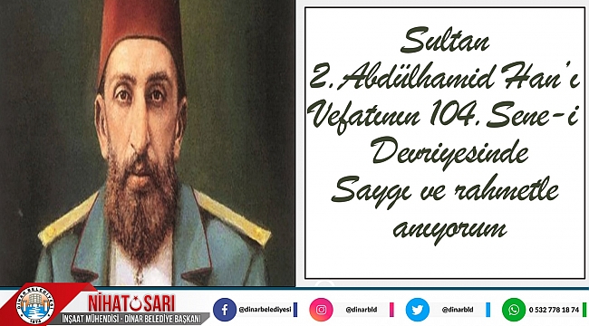 Dinar Belediye Başkanımız Nihat Sarı, Sultan II.Abdülhamid Han’ın vefatının 104. Sene-i devriyesi dolayısıyla bir mesaj yayımladı. Belediye Başkanımız Nihat Sa