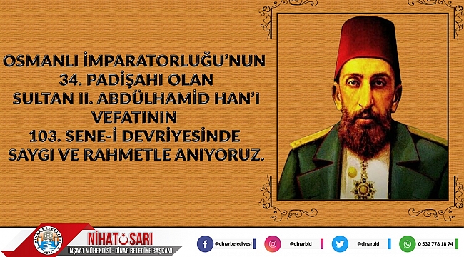Dinar Belediye Başkanımız Nihat Sarı, Sultan II.Abdülhamid Han’ın vefatının 103. Sene-i devriyesi dolayısıyla bir mesaj yayımladı.