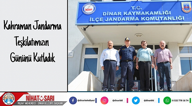 Ziyarette; Dinar İlçe Jandarma Komutanı Binbaşı Necip Kacar'ın ve askerlerimizin gününü kutlayan Dinar Belediye Başkanımız Nihat Sarı, "Kanun ordusu Jandarma Teşkilatımızın mensupları kahraman askerlerimiz vatanımız için mesai mefhumu gözetmeksizin gece gündüz demeden görev yapıyor. Ülkemizin refahı için görev yapan kahraman askerlerimizin Rabbim yar ve yardımcısı olsun. Bu duygu ve düşüncelerle vatanımız uğruna gözünü kırpmadan şehit olan başta Gazi Mustafa Kemal Atatürk olmak üzere tüm şehitlerimize Yüce Allah’tan rahmet, gazilerimize sağlıklı ömürler diliyor, görev yapan askerlerimize ise görevlerinde kolaylıklar diliyorum. "dedi.