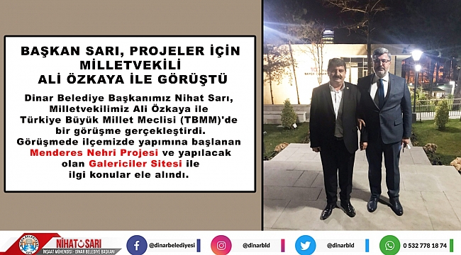 Dinar Belediye Başkanımız Nihat Sarı, Milletvekilimiz Ali Özkaya ile Türkiye Büyük Millet Meclisi (TBMM)'de bir görüşme gerçekleştirdi.