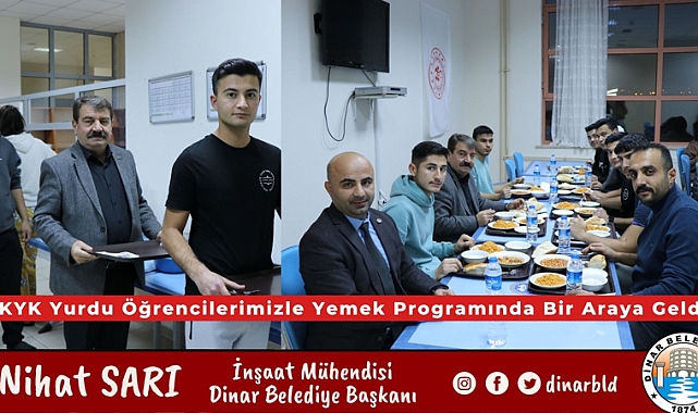 Dinar Belediye Başkanımız Nihat Sarı, Dinar Yüksek Öğrenim Kredi ve Yurtlar Kurumu öğrencileriyle Yemek Programında Bir Araya Geldi.öğrencilerimizin yurdunun ihtiyaçları ile ilgili talep edilen her türlü konuda yardımcı olduklarını ve her zaman yanlarında olduklarını ifade etti.Dinar Belediye Başkanımız Nihat Sarı öğrencilerimize yemek sırasında birtakım hediyeler taktim etti.