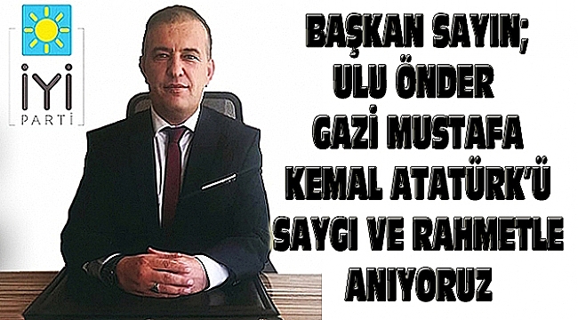 İYİ Parti Dinar İlçe Başkanı Oktay Sayın 10 Kasım Atatürk’ü anma günü dolayısıyla bir mesaj yayınladı.Başkan Sayın mesajında;Cumhuriyetin kurucusu Mustafa Kemal Atatürk’ün ölümünün 82. yıl dönümünde ona olan sevgimizin ve saygımızın en derin duygularındayız. Yüce önder Atatürk, yaşamının her anında Türk milletine örnek olmuştur. En güvendiği gençlere Cumhuriyeti teslim ederken onlara olan inancını en yüce şekilde anlatmıştır. Bu duygu ve düşüncelerle Ulu Önder Gazi Mustafa Kemal Atatürk'ü saygı ve rahmetle anıyor sevgilerimizi sunuyorum. dedi.