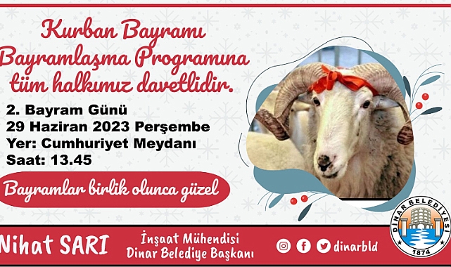 İlçe Kaymakamlığımız ve belediyemiz iş birliği ile düzenlenen Kurban Bayramı Bayramlaşma programı bayramın 2. Günü yani 29 Haziran 2023 Perşembe günü İlçemiz Cumhuriyet Meydanımızda gerçekleşecektir.