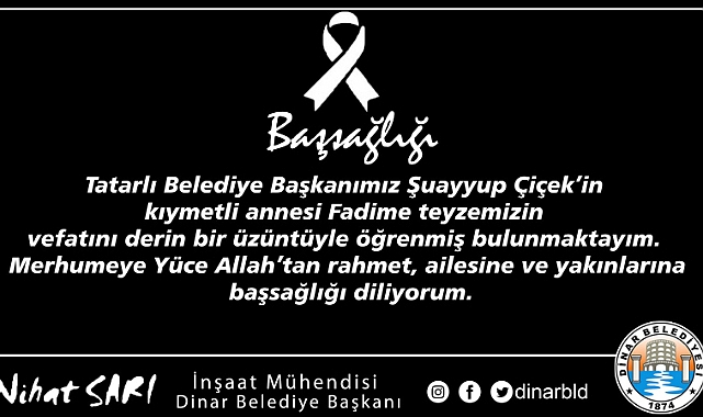 Dinar Belediye Başkanımız Nihat Sarı, Tatarlı Belediye Başkanı Şuayyup Çiçek’in annesi Fadime Çiçek’in vefatı dolayısıyla bir başsağlığı mesajı yayımladı.