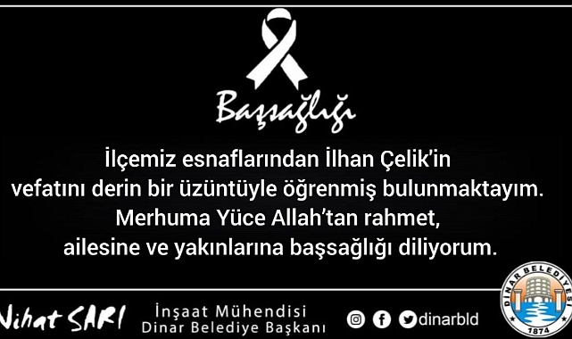 Dinar Belediye Başkanımız Nihat Sarı, İlçemiz esnaflarından İlhan Çelik'in vefatı dolayısıyla bir başsağlığı mesajı yayımladı.
