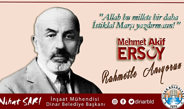 Belediye Başkanımız Nihat Sarı’dan Mehmet Akif Ersoy’u Anma Mesajı Dinar Belediye Başkanımız Nihat Sarı Mehmet Akif Ersoy’un vefatının 86.yıldönümü dolayısıyla bir anma mesajı yayımladı.Belediye Başkanımız Nihat Sarı, yayımladığı mesajında; “Aziz Milletimizin bağımsızlık mücadelesini en güzel duygularla kaleme alarak İstiklal Marşımızı yazan Milli Şairimiz Mehmet Akif Ersoy'un yazmış olduğu Istiklal Marşımız 12 Mart 1921 tarihinde, Türkiye Büyük Millet Meclisimiz tarafından devletimizin ve milletimizin bağımsızlığının sembolü olarak kabul edilmiştir. Milli Şairimiz Mehmet Akif Ersoy, Türk Milleti’nin vatan sevgisini ve bağımsızlığa olan aşkını İstiklal Marşı’nda en güzel şekilde anlatmış, Milletimizin duygu ve düşüncelerine en iyi şekilde tercüman olmuştur. Aziz milletimizin kahramanlığını, azmini ve cesaretini ölümsüzleştirmiş olan İstiklal Marşı, bugüne kadar olduğu gibi bundan sonra da bu kutsal vatanın semalarında yankılanmaya devam edecektir.