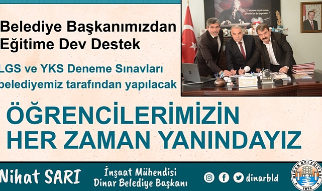 Dinar Belediye Başkanımız Nihat Sarı’nın, İlçe Kaymakamımız Kemal Duru ve İlçe Milli Eğitim Müdürü Ufuk Taşbaş ile birlikte imzaladığı protokol kapsamında belediyemiz tarafından Eğitim öğretim süresi boyunca 4 deneme sınavı ortaokul öğrencilerimize 4 deneme sınavı ise lise öğrencilerimize ücretsiz olarak yapılacak.