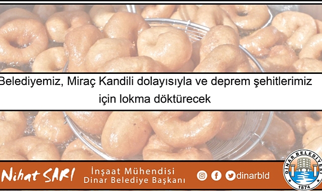 Üzücü depremde hayatını kaybeden vatandaşlarımıza Yüce Allah’tan rahmet dileyen Dinar Belediye Başkanımız Nihat Sarı, “İnsanlığa rahmet olarak gönderilen sevgili Peygamberimizin göğe yükselişini kutlarken, ülkemizde yaşanan deprem dolayısıyla derin bir üzüntü içerisindeyiz. Depremde hayatını kaybeden vatandaşlarımızın ruhuna ithafen ve Miraç Kandili dolayısıyla ikram edeceğimiz lokma tatlısını Rabbim kabul eylesin. Rabbim bizleri afetinden korusun” dedi.Dinar Gündem