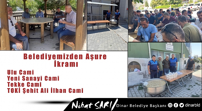 Aşure Günü dolayısıyla Belediye Başkanımız Nihat Sarı’nın sosyal belediyecilik çalışmaları kapsamında Belediyemiz tarafından aşure ikramı yapıldı.Cuma namazının ardından Ulu Cami başta olmak üzere, TOKİ Şehit Ali İlhan Cami, Yeni Sanayi Camisi ve Tekke Camisinde aşure ikramı yapıldı.Yeni Sanayi Camisinde Cuma namazını kılan Dinar Belediye Başkanımız Nihat Sarı, Muharrem Ayı’nda aşure geleneğini devam ettirdiklerini belirterek “Öncelikle vatandaşlarımızın Muharrem Ayı mübarek olsun. Muharrem Ayı tarihte birçok olayın yaşandığı ve birçok peygamberin mucizelerinin gerçekleştiği bir ay. Dinar Belediyesi olarak göreve geldiğimiz günden bu yana devam ettiğimiz aşure ikramı geleneğimizi sürdürüyoruz. Aşure demek bolluk, bereket ve kardeşlik demek. Allah birliğimizi, beraberliğimizi ve kardeşliğimizi daim eylesin.” dedi.Dinar Gündem Gazetesi