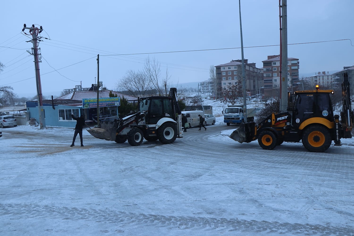 Dinar İlçemizde sabah saatlerine doğru etkili olan kar yağışı sonucunda kazaların ve buzlanmanın önlenmesi amaçlı Dinar Belediye Başkanımız Nihat