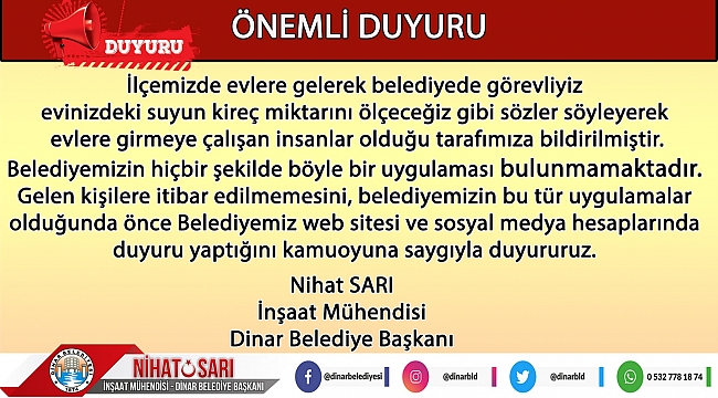 Belediyemizin hiçbir şekilde böyle bir uygulaması bulunmamaktadır. Gelen kişilere itibar edilmemesini belediyemizin bu tür uygulamalar olduğunda önce Belediyemiz web sitesi ve sosyal medya hesaplarında duyuru yaptığını kamuoyuna saygıyla duyururuz.