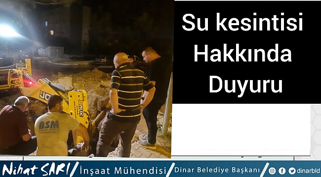Dinar İlçemizde Fiber hattı döşeme sırasında verilen hasardan dolayı meydana gelen su arızası dolayısıyla bir süre su kesintisi devam ede