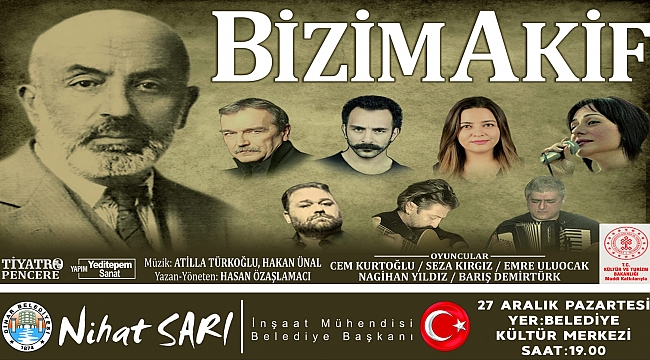 Dinar Belediye Başkanımız Nihat Sarı’nın talimatlarıyla belediyemiz Kültür Hizmetleri kapsamında 27 Aralık Pazartesi günü saat 19:00’da Belediyemiz Kültür Salonunda Yeditepem Sanat ekibi tarafından ücretsiz olarak “Bizim Akif” adlı tiyatro gösterisi gerçekleştirilecektir.