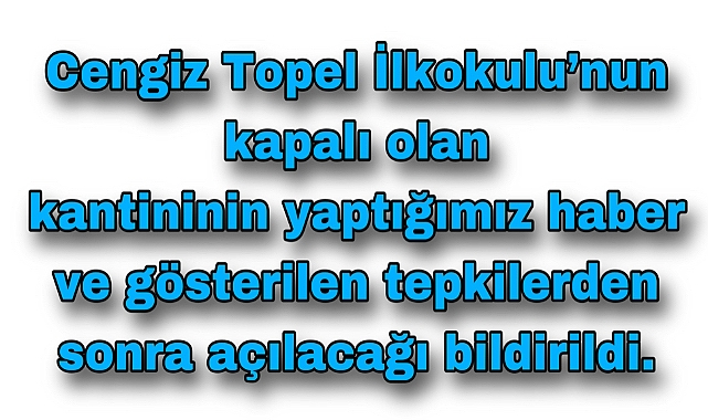 Cengiz Topel ilkokulu kantini ile ilgili yaptığımız haber ve vatandaşın da tepkisi ile kapalı olan kantinin açılacağı bildirildi.İhbar Hattımıza Gelen Mesaj:“Cengiz Topel ilkokulunda bu yıl kantin kapalı olacakmış ihaleye de çıkmamış yetkililere duyursak da ilgilenseler yazık öğrenciler 3 gündür üzülüyorlar. Yetkili Kurumun İlgileneceğine İnanıyoruz.”Pazar mahallesi muhtarı Suat Gölcük ve konak mahallesi muhtarı Vasfi Gültaş’ın girişimleriyle Cengiz Topel ilkokulu kantininin açılacağı bildirildi. Vatandaşın büyük tepkisini alan okul kantininin kapalı olması tepkilerden sonra açılacağı bildirildi.