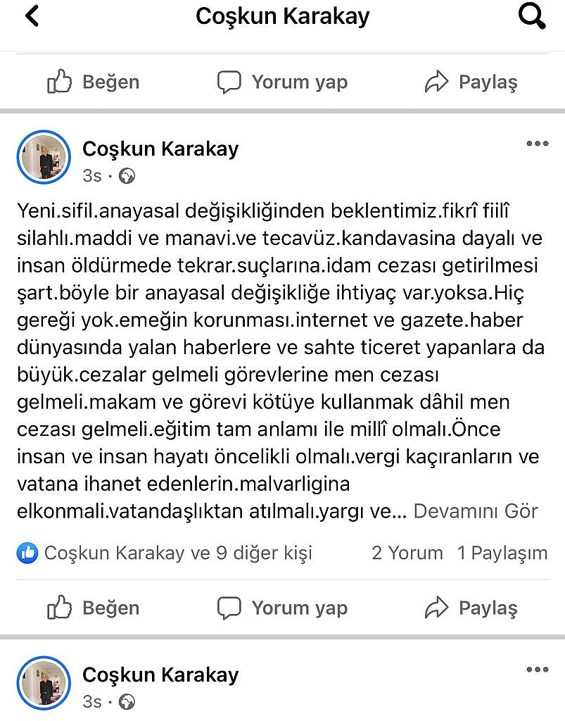 Coşkun Karakaya,’ İdam Cezası Getirilmesi Şart’ Coşkun Karakaya sosyal medya hesabından yayınladı. Coşkun Karakaya, ‘Yeni.sifil.anayasal değişikliğinden beklentimiz.fikrî fiilî silahlı.maddi ve manavi.ve tecavüz.kandavasina dayalı ve insan öldürmede tekrar.suçlarına.idam cezası getirilmesi şart.böyle bir anayasal değişikliğe ihtiyaç var.yoksa.Hiç gereği yok.emeğin korunması.internet ve gazete.haber dünyasında yalan haberlere ve sahte ticeret yapanlara da büyük.cezalar gelmeli görevlerine men cezası gelmeli.makam ve görevi kötüye kullanmak dâhil men cezası gelmeli.eğitim tam anlamı ile millî olmalı.Önce insan ve insan hayatı öncelikli olmalı.vergi kaçıranların ve vatana ihanet edenlerin.malvarligina elkonmali.vatandaşlıktan atılmalı.yargı ve tüm ceza hukuku değişmeli.partiler.kanunu değişmeli.ve devleten alınan desdekler kesilmeli ve her parti kendi içinde üye bazında seçimlerini yapmalı her kademe seçimlerini.genel başkanlık dâhil.kayıtlı olan üyeler cüzi miktat aidat ödemeli..ki..gerçek çoğulcu.seçme ve seclilme hakkına sahip olsunlar.siyaset.sermaye ve diplomalı cahillerin elinden alınabilsin.liyakati ile hâk edenlerin.temsil edeceği bir kurum haline.gelenilsin.ki.halk ozaman kendi seçtikleri ile idare.edilir hale gelmeli.yoksa.bürokratik devletin değiştireceği anayasadan da fayda gelemez bu millete.secen aynı seçilen aynı düzen aynı.kalır.maalesef.vekil olup.ömür boyu emekli vekil maaşına son verilmeli.her emekli ne alıyorsa.sosyal DEVLET te.emeklilik standartları getirilmesi şart.’dediDinar Gündem Gazetesi