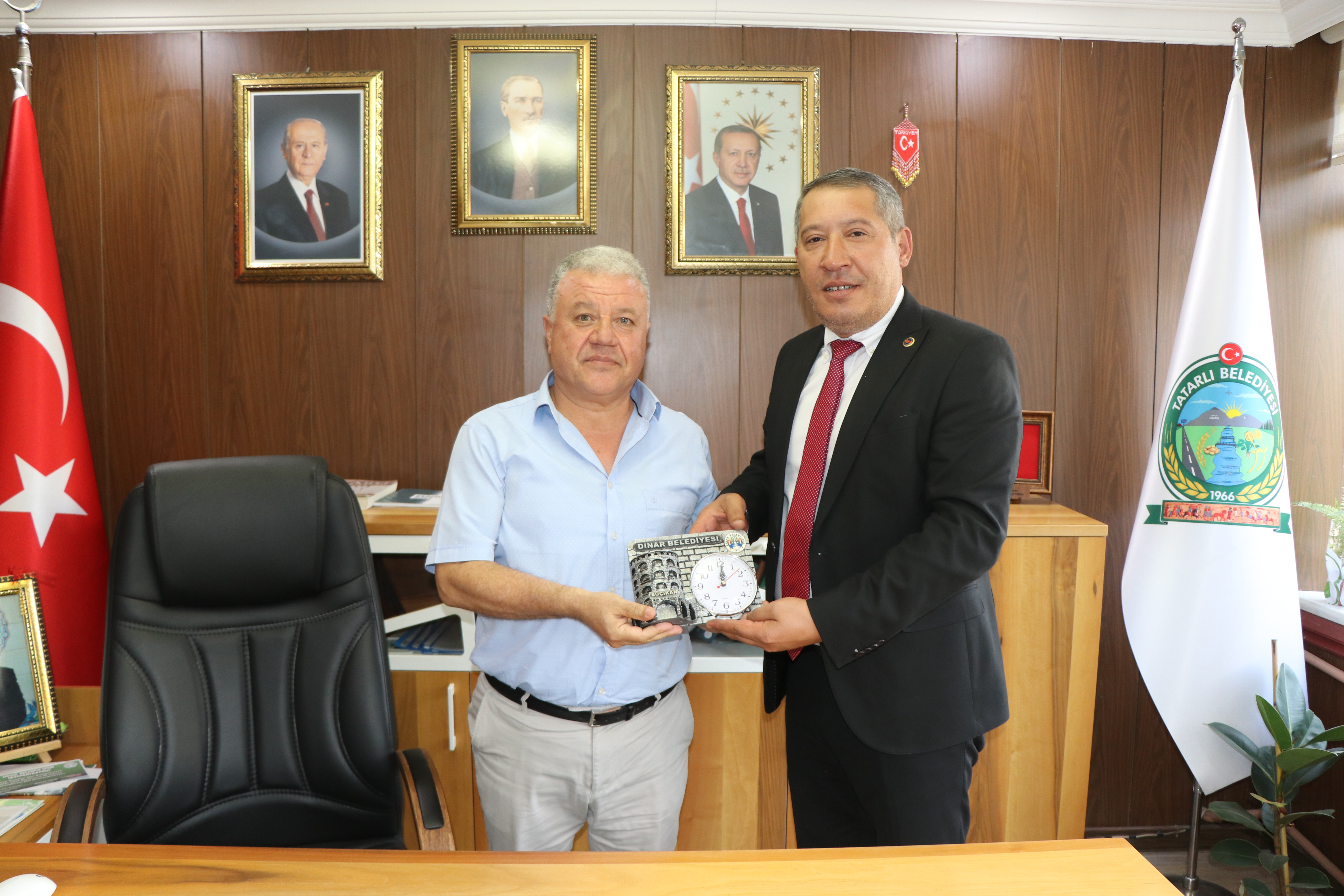 Dinar Belediye Başkanımız Veysel Topçu, Tatarlı Belediye Başkanımız Musa Kayer’i makamında ziyaret etti. Görüşmede, iki belediye arasında iş birliği ve dostluğun önemine vurgu yapıldı.Ziyaret sırasında Belediye Başkanımız Veysel Topçu, Tatarlı Belediye Başkanımız Musa Kayer’e üzerinde belediyemizin logosu bulunan saat hediye etti.