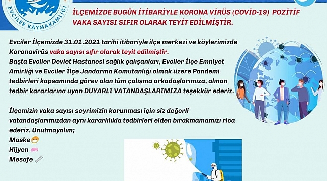 Evciler İlçemizde 31.01.2021 tarihi itibariyle ilçe merkezi ve köylerimizde Koronavirüs vaka sayısı sıfır olarak teyit edilmiştir.