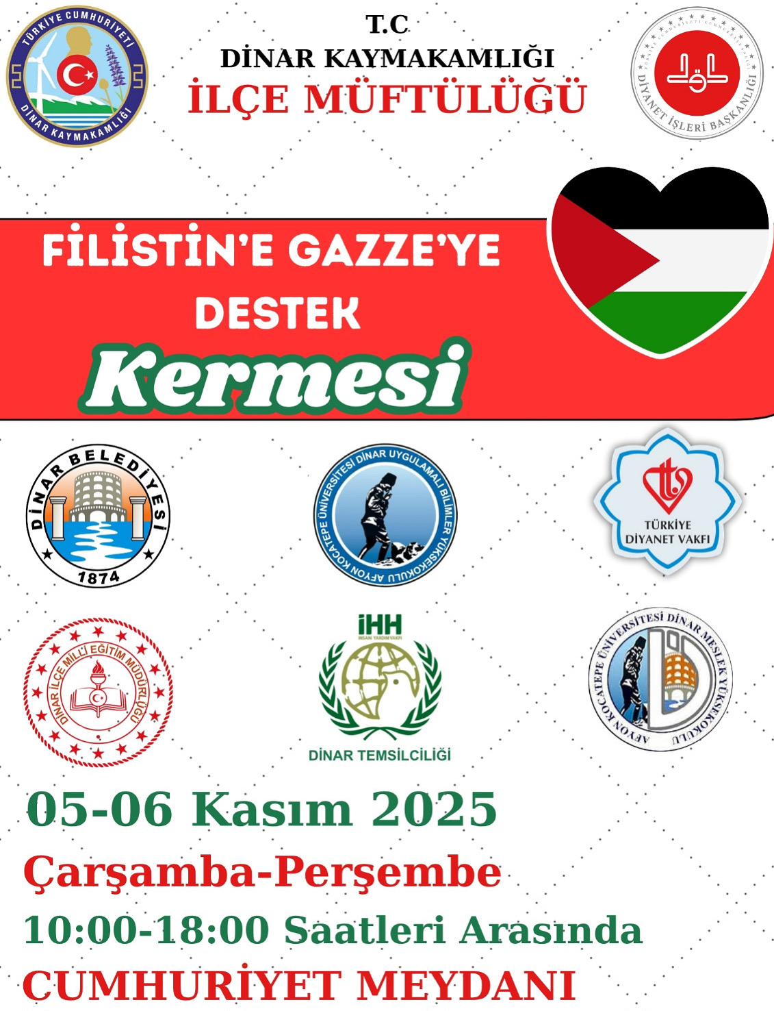 Dinar Kaymakamlığı İlçe Müftülüğü öncülüğünde Filistin ve Gazze’de yaşanan insanlık dramına dikkat çekmek ve yardım amacıyla destek kermesi düzenleniyor. Toplanan gelirlerin ihtiyaç sahiplerine ulaştırılacağı etkinlik, çeşitli kurumların iş birliğiyle gerçekleştirilecek. Kermese; Dinar Belediyesi, Türkiye Diyanet Vakfı, İHH Dinar Temsilciliği, İlçe Milli Eğitim Müdürlüğü ile Afyon Kocatepe Üniversitesi Dinar Uygulamalı Bilimler Yüksekokulu ve Dinar Meslek Yüksekokulu da destek veriyor. Etkinlik, 05–06 Kasım 2025 tarihlerinde Çarşamba ve Perşembe günleri 10.00–18.00 saatleri arasında Cumhuriyet Meydanı’nda yapılacak. Düzenleyici kurumlar tüm halkı kermese davet ederek, yapılacak katkıların Gazze’deki mağdur vatandaşlar için büyük önem taşıdığını vurguladı.Dinar Gündem Gazetesi