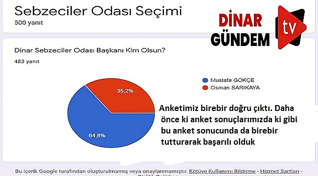 Gündemi takip eden değil gündemi belirleyen gazeteyizDinar Sebzeciler ve Pazarcılar Odası seçim öncesi Dinar halkının nabzını tutuğumuzda ankette Mustafa Gökçe yüksek oy olarak başkan seçilmişti.Osman Sarıkaya ise ankette az bir fark ile seçimi kaybetmişti. Seçimde anketimizin ne kadar başarılı olduğunu hep birlikte bir kez daha gördük. Anketimize katılan herkese teşekkür ediyoruz.Dinar’da Gündemi takip eden değil Gündemi belirleyen Gazetecilik anlayışımız ile halkımızın nabzını tutmaya devam edeceğiz.