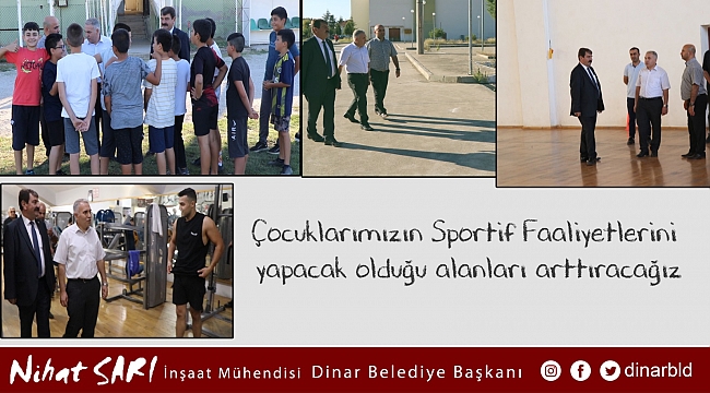 Dinar Kaymakamımız Kemal Duru ve Dinar Belediye Başkanımız Nihat Sarı, ilk olarak İlçe Stadyumumuzda spor yapan çocuklarımız ile bir süre sohbet edip, çocuklarımıza sportif faaliyetlerini yapacak oldukları yeni alanlar kazandıracaklarını belirttiler. Akabinde ise Kapalı Spor Salonumuzda incelemelerde bulunarak Fitnıs salonumuzdan faydalanan vatandaşlarımız ve gençlerimiz ile sohbet ederek, çocuklarımızı ve gençlerimizi sportif faaliyetler yapmaya teşvik etmek için proje ve etkinliklerin daha fazla yapılacağını belirttiler.DİNAR GÜNDEM