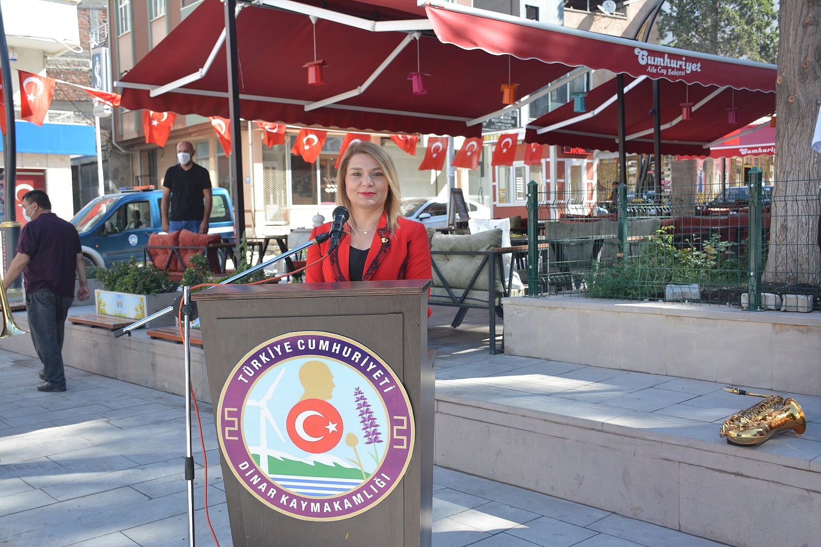 Resmi tören Dinar İlçe Kaymakamlığı ve Belediye Başkanlığımız tarafından çelenklerin Atatürk anıtına bırakılmasının ardından saygı duruşu ve Belediye bandomuz eşliğinde İstiklal Marşı’nın okunmasıyla devam etti.