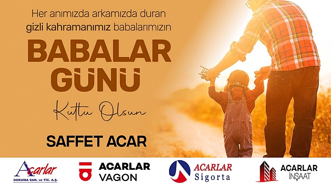 İş İnsanı Saffet Acar, babalar günü dolayısıyla bir kutlama mesajı yayınladı.İş İnsanı Saffet Acar, “Toplumu oluşturan ailelerin yapısında temel direk olarak kabul edilen babalarımızın çocuklarına her zaman şefkat ve sevgiyle yaklaştıkları, çocukların da babalarına saygı ve hürmet duyarak sonsuza kadar süren bir yaşam kurmaları dileklerimle. Tüm babalarımızla birlikte, Özellikle de Yavrusunu vatan uğruna gazi etmiş, şehit vermiş babalarımızın babalar gününü kutlarım.“dedi.